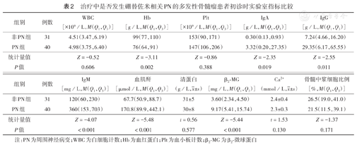 注:PN为周围神经病变;WBC为白细胞计数;Hb为血红蛋白;Plt为血小板计数;β2-MG为β2-微球蛋白