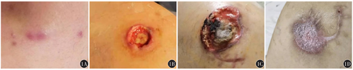 2021年9月患者在外院就诊,乳酸脱氢酶(LDH)正常,EBV-DNA未检出,骨髓细胞学未见明显异常。确诊为非霍奇金淋巴瘤ALK阳性间变大细胞淋巴瘤(ALCL)T2aN0M0,年龄校正的国际预后评分(aaIPI)评分0~1分,给予1个周期CHOP(环磷酰胺、长春新碱、多柔比星、泼尼松)方案化疗,疗效欠佳,创口先缩小后增大至7.5 cm×7.5 cm(图1C),期间多次就诊于我院清创换药,创面难以愈合。患者右腹股沟区触及新发肿物,抗炎后自行消退,考虑炎症反应性淋巴结肿大。分别于2021年10月22日、11月12日给予2、3个周期维布妥昔单抗(BV)联合CHP(BV 1.8 mg/kg,142 mg第1天;环磷酰胺1.5 g第1天;表柔比星150 mg第1天、泼尼松100 mg第1天至第5天)方案治疗,2个周期后PET-CT评价疗效为部分代谢缓解。2021年12月8日至2022年1月23日患者于我院行第4~6个周期BV联合CHP方案治疗,6个周期治疗后创面愈合(图1D)。建议再行2个周期化疗,患者自感无不适后,拒绝继续治疗,现已失访。