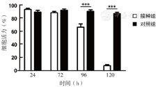 标本接种于Vero细胞后24 h,接种组细胞无脱落,亦无明显细胞病变效应(Cytopathogenic effect,CPE)出现,对照组细胞已覆盖整个细胞培养瓶底,呈成纤维细胞型生长,状态良好。标本接种后72 h,接种组CPE仍不明显,只有极少部分Vero细胞形态发生变化,伸出的细胞突起出现回缩,但细胞折光性并无明显增强,亦没有观察到明显的细胞融合现象。标本接种细胞后96 h,接种组的细胞出现明显CPE,其典型特征是细胞表面出现多个局灶性病变,病变细胞出现大量脱落,显微镜下可观察到几十微米到几百微米大小不等的空斑,同时病变细胞折光性增强,部分细胞开始融合,形成合胞体,此时CPE可判定为+。标本接种120 h后,接种标本的Vero细胞已全部出现CPE,此时可判定为++++,对照组细胞覆盖整个瓶底,长成多层,形态正常,仅少部分细胞出现脱落(图1)。细胞活力测定结果显示,0~72 h接种组和对照组细胞活力无明显差异,96 h接种组细胞活力明显下降,与对照组差异存在统计学意义(P<0.01)(图2)。
