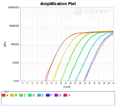 本研究中所抽提的质粒物质的量浓度为1.3×10-12 mol/μL,根据相对分子质量,计算出质粒拷贝数为7.8×1010/μL,用ddH2O将质粒稀释至107拷贝/μL,然后再做10倍递度稀释,设制6个浓度递度,以Ct值为Y轴,拷贝数对数为X轴,建立y = -3.3517x + 39.049,R2=0.999的标准曲线(图3、图4)。
