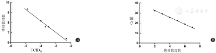A:TCID50与拷贝数对应关系;B:标准品线性回归曲线