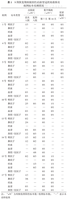 9例恢复期核酸阳性的新型冠状病毒肺炎病例标本检测情况