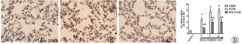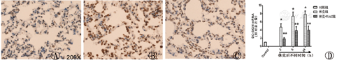 注:Ⓐ:对照组;Ⓑ:失血性休克24 h组;Ⓒ:失血性休克+维生素C 24 h组;Ⓓ:各组肺组织DC-SIGN mRNA表达水平。*与对照组相比,P<0.05,**取材时间点相同的失血性休克+维生素C组与失血性休克组相比,P<0.05。