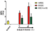 MPO活性是反映中性粒细胞浸润程度的可靠指标。结果显示,失血性休克6 h、24 h组,肺组织MPO活性较对照组显著增高,差异有显著统计学意义(P<0.05),提示中性粒细胞浸润数量增多;失血性休克+维生素C 6 h、24 h组大鼠肺MPO活性与取材时间点相同的失血性休组相比均明显降低(P<0.05)(见封三,图4)。