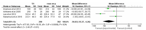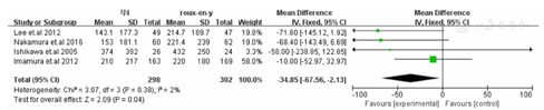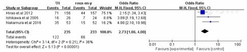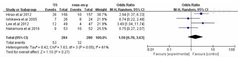 纳入随机对照研究6篇,病例总数600例。荟萃分析结果显示Roux-en-Y重建方式较毕Ⅰ相比需要更长的手术时间[WMD=-30.82,95%CI(-55.37,-6.26),P=0.01]。Roux-en-Y组在减少胆汁反流[OR=30.31,95%CI(8.74,105.15),P<0.00 001]和残胃炎[OR=2.73,95%CI(1.86,4.00),P<0.00 001]的发生上明显优于毕Ⅰ组。