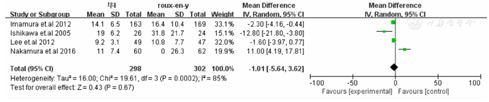 中文以"毕I""Roux-en-Y""远端胃癌根治术""重建"为关键词,英文以"Billroth-I""Roux-en-Y""distal gastrectomy""reconstruction"为关键词,通过检索中国知网、万方、Medline、Pubmed、Embase,纳入对比毕I和Roux-en-Y两种重建方式的的随机对照试验,并逐个进行质量评价和资料提取。将手术时间、术中出血、手术时间、术中出血、术后住院天数、术后恢复流质饮食时间、术后出现恶心呕吐、吻合口漏、吻合口狭窄、术后体重变化、残胃炎、反流性食管炎、胆汁反流和胃排空障碍做为评价指标。统计学分析采用RevMan 5.3软件。