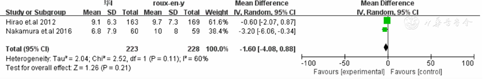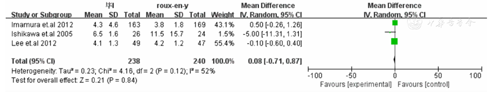 本观察结果显示毕Ⅰ和Roux-en-Y在术后体重变化上差异并没有统计学意义,一些学者为毕I可以较大可能的保持消化道的连续性,但食物是否进入十二指肠并不是患者营养状态的决定因素,本次观察再次证实了这一点。虽然纳入2篇文章对于术后体重变化的随访时间有差异但对于胃癌术后患者术后1年基本已恢复其正规饮食。Nomura等[18]的研究表明对于肿块位于下1/3的远端胃癌患者,剩余的胃越多对于术后营养状况的影响越小。在术后住院时间和重新进食流质时间上毕Ⅰ组和Roux-en-Y组的差异同样没有统计学意义。