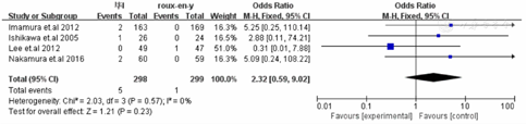 对于胃癌患者来说,手术仍然是治疗胃癌的最佳选择。对于远端胃癌根治术后选择何种重建方式目前仍未达成共识。理想的重建方式应该不仅可以减少术后并发症,同时应该提高患者术后的生活质量[10]。毕Ⅰ和Roux-en-Y是目前远端胃癌术后标准的重建方式。本研究通过将过往比较这两种重建方式的随机对照研究进行荟萃分析,结果发现Roux-en-Y相比毕Ⅰ可以明显减少术后胆汁反流和残胃炎的发生。一些研究表明胆汁的反流可以增加术后残胃癌的发病率[11],因此在减少术后残胃癌的发病率上Roux-en-Y较毕Ⅰ更有优势。Namikawa等[12]研究者发现行毕Ⅰ重建后His角的角度相比行Roux-en-Y重建后更大,这样造成毕Ⅰ相比Roux-en-Y更容易发生术后反流性食管炎。Takiguchi等[5]在对毕Ⅰ和Roux-en-Y两种重建方式术后生活质量的评估上也发现接受毕Ⅰ手术的患者术后更容易出现灼心症状,这与胆汁和胃液反流至食管有着密切关系。Xiong等[13]在对毕Ⅰ和Roux-en-Y两种重建方式的荟萃分析发现两种方式毕Ⅰ较Roux-en-Y更容易出现胆汁反流和残胃炎,且两者差异具有统计学意义,但两者反流性食管炎的发病率差异并无统计学意义。本荟萃分析同样发现毕Ⅰ更容易出现胆汁反流和残胃炎,虽然毕Ⅰ重建术后更容易出现反流性食管炎但是与Roux-en-Y相比二者的差异并无统计学意义。