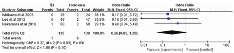与Xiong等[13]的荟萃分析相比本观察增加了新的随机对照研究使得结论更加可靠,进一步增加对比了两种手术方式术后出现的恶心呕吐症状的发病率,得到Roux-en-Y组较毕Ⅰ组更容易出现恶心和呕吐症状。同样新发现毕Ⅰ相比Roux-en-Y不仅更节省手术时间且术中出血更少。总的来说通过本篇荟萃分析,Roux-en-Y相比毕Ⅰ可以明显减少患者术后残胃炎的发生和胆汁反流,从而进一步减少患者术后残胃癌发生可能。且Roux-en-Y并不增加术后吻合口漏和狭窄发生的风险。但是对于Roux-en-Y和毕Ⅰ这两种手术方式的哪一种更适合远端胃癌根治术仍需更科学的多中心的随机对照研究来证实。