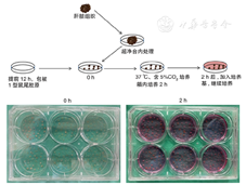 注:肝硬化组织来源纤维母细胞分离培养过程,将组织块剪碎至大小0.5~1.0 mm3,接种至提前包被有鼠尾胶原的培养板中,置于37 ℃、含5%CO2的培养箱内培养,2 h后组织块贴壁良好,加入培养基,静置培养。