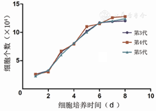 注:第3~5代纤维母细胞生长曲线类似,近似"S"形生长。纤维母细胞于第二天进入快速生长期,约于培养第6天进入细胞生长平台期。