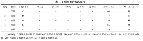 | 编号 | 性别 | 年龄(岁) | HBsAg | 抗-HBs | HBeAg | 抗-HBe | 抗-HBc | ALT(U/L) | AST(U/L) |