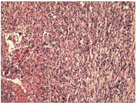 完善术前准备,予以在全麻下行剖腹探查术,术中见:腹腔内无积液,肝、胃、十二指肠未见异常,右上腹轻度粘连,中腹部距离屈氏韧带约40 cm处可见一大小约9 cm×7 cm×5 cm包块,与腹壁、大网膜、回肠及横结肠粘连严重,锐钝性相结合分离包块与周围的粘连后发现肿块下缘与空肠形成内瘘,瘘口旁坏死组织内可见一长约1 cm质硬条状物,形似鱼骨刺,考虑质硬条状物刺破肠管形成炎性包块,因瘘口周围肠管炎症水肿较重,遂术中即行包块切除+病变段肠管切除+空肠侧侧吻合术,术后恢复良好,治愈出院。病理检查:包块内增生性纤维胶原组织伴多量浆细胞、嗜酸性粒细胞浸润,部分区出血、坏死,大量中性粒细胞浸润,考虑炎症性病变(见封四,图2)。