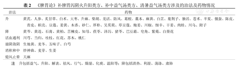 表1中前12首病机着眼点在虚和湿,其中伴有热象的升阳益胃汤、益胃汤、草豆蔻丸、神圣复气汤疗"阴火症候群"(原书针对脾胃阴火、暑湿耗伤、湿热痿证3类病机证侯相近的病证而设,涉及神志、呼吸、消化、泌尿、运动等系统的症状,本文统归为"阴火症候群"[3,4,5],症状繁杂,病情深重,考虑和传染病有关),生姜和中汤治肢乏口渴。不伴有热象的通气防风汤、半夏白术天麻汤、除风湿羌活汤、强胃汤、温胃汤、丁香茱萸汤、交泰丸七方,分别针对脾虚湿重所致的恶寒、眩晕头痛、恶呕胀闷、脘痛纳差、肢体麻木痹痛、二便失调等证。至于清阳汤和胃风汤均治面疾,前者针对胃热汗出者,血虚寒中面瘫,后者针对虚风证,面肿目瞤牙搐;在补气升阳祛湿泻火基础上,清阳汤以大量活血药温经通络祛"筋脉血络中大寒",而胃风汤中白芷、蔓荆子为东垣治头面常用药。