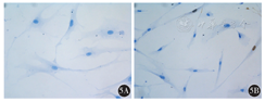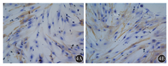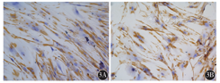 细胞免疫化学结果显示,Vimentin蛋白主要表达在细胞质,为棕褐色,原代分离培养的乳腺癌旁成纤维细胞及乳腺癌CAF均有表达(图3);α-SMA主要表达在细胞质中,细胞核有少量表达,为棕褐色,在乳腺癌CAF和乳腺癌旁成纤维细胞中均有表达(图4);Ki-67蛋白在细胞核中表达,为棕褐色,乳腺癌CAF较乳腺癌旁成纤维细胞表达明显增加(图5)。
