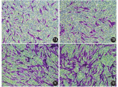 用50 mg/L Matrigel(美国BD公司)1∶8稀释液包被孔径为8.0 μm的Transwell小室(美国Corning公司)底部膜的上室面,置37 ℃ 30 min,使Matrigel聚合成凝胶,下室加入600 μl含10% FBS的DMEM完全培养液。将培养至第三代的CAF消化成单个细胞,调整细胞密度,用无血清DMEM培养液重悬,吸取200 μl细胞悬液,加入Transwell小室底部膜的上室面凝胶上层,细胞8 000个/孔,置37 ℃、5% CO2培养箱中培养24~48 h,固定,结晶紫染色,显微镜下计数。