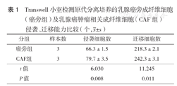 Transwell小室侵袭、迁移实验结果发现,乳腺癌旁成纤维细胞和乳腺癌CAF都具有较强的迁移、侵袭能力(图7)。乳腺癌CAF较乳腺癌旁成纤维细胞具有更强的迁移能力和侵袭能力,差异有统计学意义(均P<0.05)(表1)。