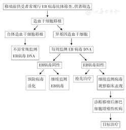 造血干细胞移植后PTLD诊治流程见图1。移植后EBV感染及EBV相关PTLD的分级处理包括EBV活化的预防、抢先治疗和目标治疗[8]。