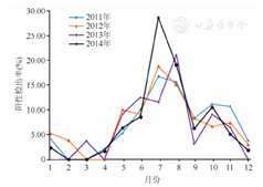 经多重荧光定量PCR检测,1 388份SARI样本中,男性患儿902例,女性患儿486例。共检出HBoV阳性85份,阳性检出率为6.12%,其中83份(97.65%)阳性样本为HBoV1,2份(2.35%)阳性样本为HBoV2。男性患儿HBoV阳性率为6.54%(59/902),女性患儿HBoV阳性率为5.35%(26/486),差异无统计学意义(χ2=0.780,P>0.05)。研究样本中患儿最小年龄为1个月,最大年龄4岁,中位年龄为5个月。按照不同年龄段自身免疫力的不同及所处环境的差异,并结合本研究的病例分布特点,分为≤6个月、>6个月~1岁、>1~3岁和>3岁四个年龄段,各年龄段HBoV阳性检出率相比,差异具有统计学意义(χ2=47.446,P<0.01)。其中>6个月~1岁年龄段HBoV阳性检出率最高,为12.84%;>3岁年龄段检出率最低,仅1.64%;≤6个月和>1~3岁年龄段HBoV阳性检出率相当,为3.04%和3.33%。按季节划分,HBoV检出率最高的是夏季(14.97%),其次是秋季(7.14%),春季(3.19%)和冬季(1.97%)检出率较低。四季检出率比较,差异具有统计学意义(χ2=58.807,P<0.01)。HBoV在2011至2014年各年的检出率分别为7.39%、7.31%、5.58%和4.72%,各年相比,差异无统计学意义(χ2=3.447,P>0.05)。2013和2014年HBoV的检出率有所降低。2011至2014年HBoV感染的月份分布情况基本一致,每年5月份开始检出率增高,7~8月为检出高峰,9月有所回落,10~11月有个小高峰,12月开始明显下降,12~4月检出率较低,见图1和表2。
