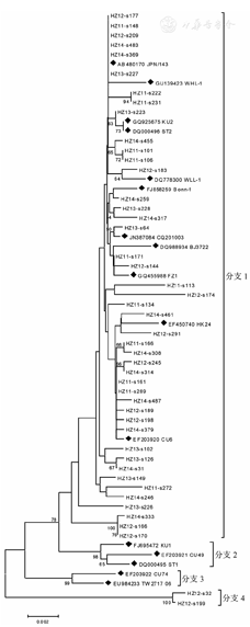 选取HBoV阳性样本中浓度较高的样本进行VP1基因扩增,产物经测序后用DNAMAN进行拼接,得到长度为2 016 bp的VP1全基因序列。将这些序列与GenBank中来自瑞典、荷兰、美国、泰国、日本等国家和中国台湾、中国香港、北京、广州和福州等地区的参考序列进行比对并构建进化树。研究得到的46株毒株序列被分成了2个分支,其中44株属于分支1,与瑞典株ST2属于同一分支;另外2株毒株HZ12-S32和HZ12-S199单独成一新的分支4,与分支1进化关系较远,该分支的形成有待于进一步研究来阐明,系统进化树见图2。