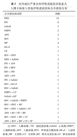 杭州地区严重急性呼吸道感染住院患儿人博卡病毒与其他呼吸道病原体合并感染分布