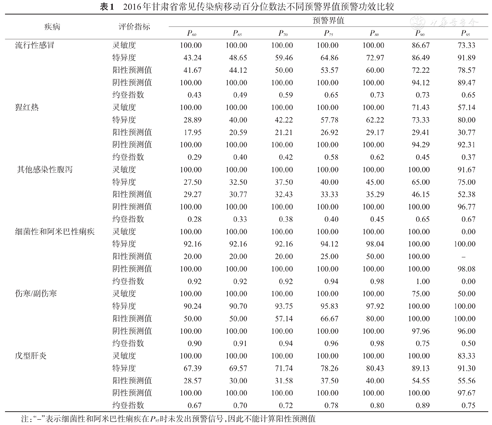 2016年甘肃省常见传染病移动百分位数法不同预警界值预警功效比较