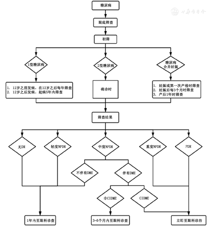 (1)如果存在以下初筛结果,需及时至眼科就诊[33]:无DR、轻度NPDR、无DME于1年内至眼科诊查;中度NPDR、非累及黄斑中心凹的DME于3~6个月内至眼科诊查;重度NPDR、PDR、非累及黄斑中心凹的DME需立即至眼科诊治。(2)如果发现以下情况需当天急诊转至眼科就诊[38]:突然的视力丧失;视网膜剥离;视网膜前或玻璃体出血;虹膜红变。