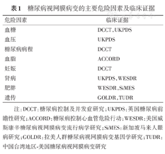 DR的主要危险因素包括高血糖或明显血糖波动、高血压、高血脂、糖尿病病程长、糖尿病肾病(DKD)、妊娠、肥胖、易感基因等(表1)[13,14]。中国人群中,已证实的DR易感基因包括CPVL/CHN2、SCAF8-CNKSR3、SCYL1BP1、API5、CRP和FNDC5等[15,16,17,18,19]。我国台湾人群的DR全基因组关联分析提示5个染色体易感区域和含PLXDC2、RhoARHGAP22的基因与DR相关,后两个基因参与内皮细胞血管生成并改变毛细血管通透性[20]。汉族人群研究提示染色体13q22.2、2q31.1和2q37.2存在3个潜在易感位点[21]。
