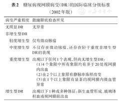 国际较为通用的临床分级标准主要采用2002年由美国眼科协会和国际眼病学会发布的《糖尿病视网膜病变的国际临床分级标准》(表2、表3)。