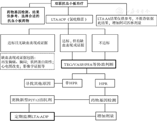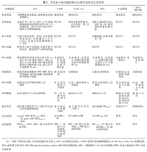 注:LTA:光学透射比浊法;ADP:二磷酸腺苷;AA:花生四烯酸;TEG:血栓弹力图;VASP:血管扩张刺激磷酸蛋白;PFA:platelet function analyzer-200检测系统:HPR:高反应性