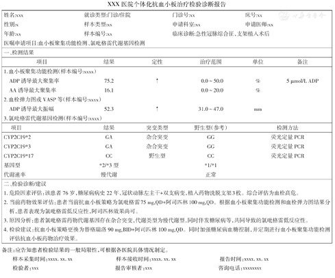 血小板功能检测报告应包含所选择的方法,诱聚剂种类、浓度,所监测药物靶点等,并由临床和实验室共同制定适合本实验室的药物治疗范围。