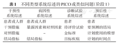 此阶段旨在评估目标问题与系统综述中拟解决问题的吻合度。评价者在制作系统综述再评价或临床实践指南时,首先需要确定想要解决的问题,即目标问题。对不同研究类型的系统综述(包括干预性、病因性、诊断试验和预后性系统综述),表1中提供了相应的评价内容。如果在PICO或类似的问题分类框架中有一个或多个分类条目不匹配,则阶段1相关性评估应该判定为"否"。如果仅评估系统综述的偏倚风险,而没有目标问题,那么可跳过该阶段(即根据情况选择)。