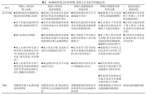 此阶段主要确定系统综述制定过程中可能产生的偏倚,涉及制定系统综述的4个领域:①研究的纳入标准;②研究的检索和筛选;③数据提取和质量评价;④数据整合和结果呈现。各领域包括3部分内容:从系统综述中寻找支持偏倚风险程度判断的信息、回答信号问题、判断偏倚风险程度。信号问题的回答有"是/可能是/可能否/否/无信息"5种,据此,每个领域的偏倚风险程度被判断为"低/高/不确定"。如果一个领域内所有信号问题的回答都是"是"或者"可能是",则偏倚风险程度被判断为"低";如果一个领域内有任何信号问题的回答是"否"或者"可能否",则存在潜在的偏倚风险。表2总结了阶段2的4个领域21个信号问题和阶段3整体偏倚风险判断的3个信号问题。对每个领域的详细描述以及如何对每个信号问题进行评价可参考ROBIS的使用指导。领域1评估系统综述的纳入标准是否预先确定、是否清晰以及是否符合系统综述的问题。领域2评估是否有符合纳入标准的原始研究未被纳入到系统综述中。领域3评估数据提取和原始研究偏倚风险评价过程是否会产生偏倚。领域4评估系统综述制定者是否采用恰当的方法合并原始研究的数据(采用定量合并或非定量合并)。
