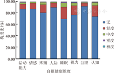 本研究8个维度自报健康状况"无困难"的比例都在70%以上,其中自理能力、人际关系2个维度达到了90%以上;而自报健康状况为"重度困难"和"极度困难"的仅有不到2%的比例(图1)。