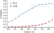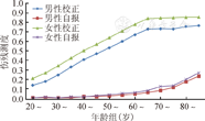 根据HOPIT模型对成年居民自报健康进行校正,校正前后成年居民伤残测度如图2所示。自报伤残测度随年龄增长变化程度不明显,而模型校正后的伤残测度随年龄增长明显升高,随着年龄的增长,伤残测度明显增高(χ2=5 795.81,P<0.001),健康水平逐渐下降,"顶效应"明显弱化,65岁以后就保持一个比较高的伤残水平。无论是自报伤残测度还是校正的伤残测度都是女性略高于男性,说明相对于男性,女性的伤残情况较严重(χ2=5 353.27,P<0.001)(图3)。