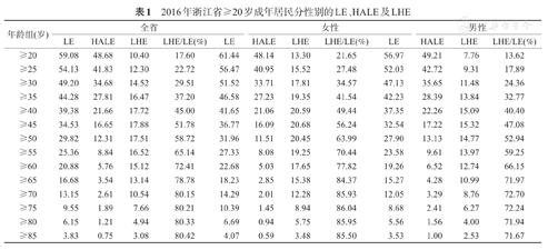 根据2016年浙江省死因监测数据、死亡漏报调查结果建立简略寿命表,计算LE。采用欧洲健康预期寿命监测组织(European Health Expectancy Monitoring Unit,EHEMU)发布的Sullivan方法测算HALE[9]。同时,根据LE和HALE还可以计算得到因伤残损失的健康期望寿命(LHE)和LHE/LE,以此来衡量不同年龄段成年居民的伤残情况。