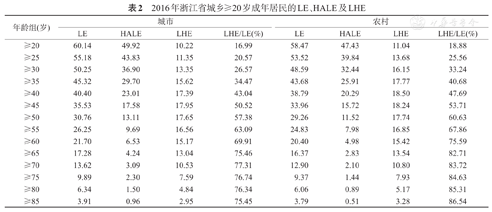 2016年浙江省城市≥20岁成年居民LE和HALE分别为60.14和49.92岁,LHE为10.22岁;农村≥20岁成年居民的LE和HALE分别为58.47和47.43岁,LHE为11.04岁;≥60岁老年人LE和HALE分别为20.40和4.98岁,LHE为15.42岁。城市各个年龄段的HALE均高于农村,但是随着年龄增加,这种差距逐渐减小(表2)。