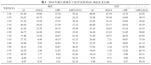 2016年浙江省城市≥20岁成年女性的LE、HALE和LHE分别为61.44、49.08和12.36岁;农村≥20岁成年女性的LE、HALE和LHE分别为60.94、47.19和13.75岁;浙江省≥20岁女性成年居民中,城市LE和HALE的值要稍高于农村LE的值,但是随着年龄的增加,这种差距逐渐减小。LHE/LE的比例农村大于城市(表3)。