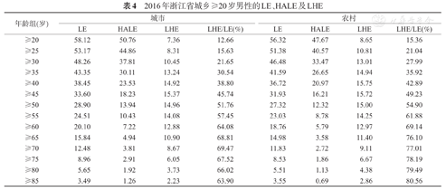 2016年浙江省城市≥20岁成年男性的LE、HALE和LHE分别为58.12、50.76和7.36岁;农村≥20岁成年男性的LE、HALE和LHE分别为56.32、47.67和8.65岁;总体来看浙江省≥20岁男性成年居民中,城市男性居民的HALE高于农村的HALE,但是随着年龄的增加,城乡居民HALE的差异逐渐减少,LHE/LE的比例农村大于城市(表4)。