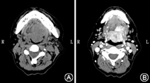 收集四川大学华西医院耳鼻咽喉头颈外科2010年1月至2018年1月收治入院,病理诊断为舌根部MEC且病历资料完整共5例患者,其中男3例,女2例;年龄27~76岁,平均53.5岁,中位年龄54岁;病程1个月至1年,平均病程约5个月;3例男性患者均有长期吸烟史,烟龄20~60年,平均烟龄36.7年,其中2例>10支/d,1例有长期饮酒史(>10年且>400 g/d)。3例以吞咽困难为主要症状,其中2例伴痰中带血,1例以声嘶和咽异物感为主诉,1例无特殊症状,为体检时发现颈部包块就诊。查体均可见舌根部来源肿物,其中2例单纯位于舌根;1例累及咽侧、咽后壁,会厌及喉;余2例累及扁桃体下极、咽侧壁和会厌谷,其中1例还侵及喉和梨状窝。舌根部肿物大小为1.5~6.0 cm(图1),质硬,其中4例肿物表面黏膜较光滑,1例表面粗糙糜烂,呈菜花状新生物,与周围组织有粘连。5例行CT及MRI检查,均显示舌根部有大小不等的软组织团块影,边界不清,增强后不均匀强化,其中3例伴有颈部淋巴结不同程度增大(图2)。