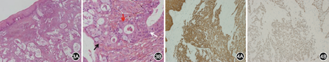 按照世界卫生组织2005年的MEC分级标准,根据肿瘤的囊性成分比例、神经侵犯程度、有丝分裂活性以及细胞间变、坏死情况可将MEC分为高、中、低三种级别。经术后病理证实,本组5例患者中有4例为舌根部MEC中级别(图3),1例为高级别;1例高级别及1例中级别MEC有双侧颈部淋巴转移,所有患者均未发现远处转移。3例(3/5)行免疫组化染色,结果均示抑癌基因P63和细胞角蛋白(cytokeratin,CK)呈阳性(图4)。本组中1例患者首诊为舌根部鳞状细胞癌,术后确诊为高级别MEC。根据涎腺癌TNM分期,本组5例有T1N0M0 1例,T2N0M0 1例,T4N0M0 1例,T4N2M0 2例;临床分期Ⅰ期1例,Ⅱ期1例,Ⅳ期3例。
