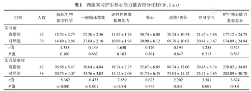 本研究结果显示实习结束时除关心维度观察组护生CINS总分及各维度得分均高于对照组,差异有统计学意义(P<0.01),表明临床护理带教中应用以核心能力为主的带教模式能有效提高实习护生的核心能力。在带教前强化带教老师培训,使其掌握不同教学方法,有助于在教学中打破常规,提高实习护生人际沟通、评判性思维等核心能力。通过实行导师制,有助于帮助护生树立正确的职业价值观。在带教过程中定期开展各种培训,通过临床观摩、情景模拟、技能竞赛、案例分析等形式组织学习,有助于提高护生的学习兴趣和积极性,培养护生主动分析能力、评判性思维能力、沟通能力,从而提高了护生的核心能力[9,10]。本研究中,实行教学查房,有利于拓展实习护生诊疗思维,强化对专业知识的了解。另外,出科考核主要以客观结构化临床考试形式进行,有助于提高护生实际解决问题的能力。研究表明,注重实习护生核心能力的培养,有利于提高其对专业的领悟,合理利用资源,优化职业规划,保证个体有效成长[11]。但本研究中实习结束时两组护生CINS量表中关心维度得分差异无统计学意义(P>0.05),分析原因可能是两种带教方法均重视对护生的关怀有关。周丽华等[12]研究表明,对实习护生实施基于职业核心能力培养的护理综合实训课程,有助于提高护生理论成绩、临床综合技能及职业核心能力,与本研究结果类似。