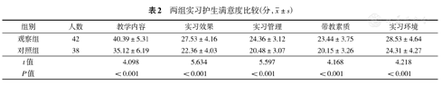 2.两组实习护生满意度比较。见表2。实习结束时观察组护生教学内容、实习效果、实习管理、带教素质、实习环境评分均高于对照组,差异有统计学意义(P<0.01)。