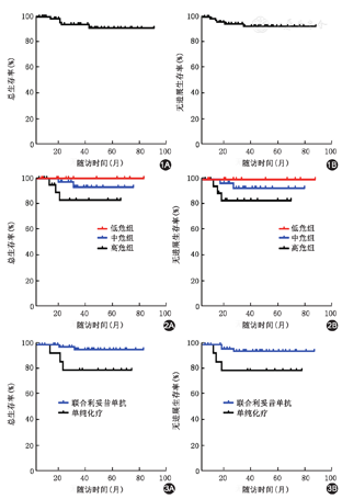 64例BL患者(95.52%)获完全缓解(CR),3例(4.48%)获部分缓解(PR),总有效率(CR+PR)为100%。中位随访44(3~89)个月,3年和5年总生存(OS)率分别为92.54%和88.98%,3年和5年无进展生存(PFS)率均为90.34%。低危、中危和高危组患者的5年OS率分别为100%、91.7%和80.0%,差异有统计学意义(P=0.048)。55例(82.09%)联合利妥昔单抗治疗,与单纯化疗组的5年OS和PFS分别为74.3%和78.6%相比,利妥昔单抗联合化疗组BL患者的5年OS和PFS分别为95.2%和95.5%,显示出明显生存优势(P值分别为0.021和0.036)。主要不良反应为骨髓抑制和黏膜炎,无治疗相关死亡。