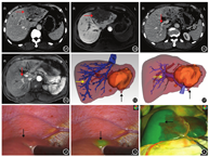 观察指标:(1)术前评估增强CT、MRI检查和基于CT-MRI融合图像的肝脏3D模型对肝脏脉管系统、肿瘤边界、肿瘤数目的显示情况。(2)术中情况:术中ICG分子荧光影像技术检查对肿瘤数目、肝段或半肝分界的显示情况,手术方式,淋巴结清扫情况,术中胆汁漏情况,手术切缘、手术时间、术中出血量、住院时间、围术期输血治疗情况。(3)不同模态影像学技术制订手术规划方案与实际手术方式的比较:CT、MRI检查和基于CT-MRI融合图像的肝脏3D模型手术规划方案与实际手术方式的比较。(4)随访情况:获得随访的患者例数、随访时间、随访期间术后并发症情况。