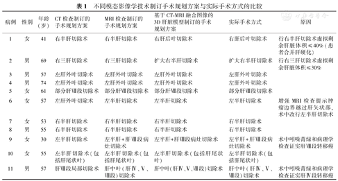 CT、MRI检查和基于CT-MRI融合图像的肝脏3D模型手术规划方案与实际手术方式一致,分别为6、9、11例。见表1。