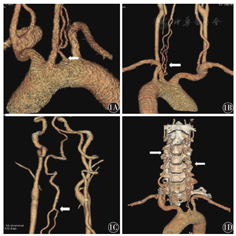 椎动脉起源异常常与椎动脉变异共同发生,而由于椎动脉变异引起的血液动力学改变,使血管内膜受损的概率有所增加。当患者出现此类血管变异后,应注意血脂及血压控制,降低发生动脉粥样硬化及血管破裂、夹层的风险。同时,椎动脉起源及走行变异,增加了脊柱、神经外科及介入手术的风险。对于未引起血液动力学改变或者患者未出现临床症状的"良性"血管变异,可以不加干预或定期体检,而对于已经产生血液动力学改变或者已经产生临床症状的"恶性"血管变异,应在患者条件允许的情况下尽早行手术治疗。CTA检查是诊断椎动脉起源异常及变异的最直接的无创性检查方法,多种CTA后重建技术的联合应用,可以全面、完整地显示椎动脉起源、走行及其与周围组织的毗邻关系,为患者颈部及椎体手术提供良好的血管成像[7]。
