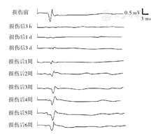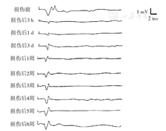 结果表明,实验组大鼠脊髓损伤后3 h scMEP波形不稳定,波幅明显减小,达正常波幅的32.69%±0.83%;2周后恢复达正常波幅的52.93%±2.23%,继而达到稳定状态,但均低于对照组,差异均有统计学意义(P值均<0.01)。而P波和N波的潜伏期无显著改变,对照组大鼠各指标均无显著改变。见图1、表1。