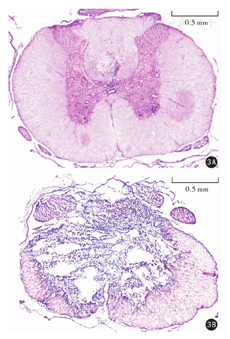 实验组大鼠脊髓损伤6周后,脊髓灰质区部分坏死灶,形成较大空腔,细胞胞浆浑浊。对照组大鼠脊髓组织结构正常。见图3。