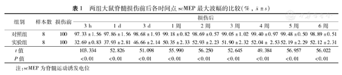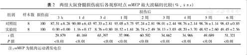 两组大鼠脊髓损伤前后各观察时点mMEP最大波幅的比较(%,